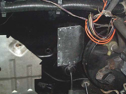 Here is a close up of one of the block off plates riveted to the firewall. These cover the holes left by the heater core, which was removed for weight and cleanliness issues. the surrounding lip was bludgeoned with a body hammer until it was flat, and then this plate was riveted over the hole.