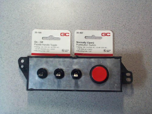 HHere is the panel out of the dash. The heater control bracket was used and a piece of sheet metal was cut to fit the opening. The part numbers on those switches is 35-180 and 35-457. These will control Ignition, starter, manual fan relay, and NOS arming relay. By the way, the easiest way I found to cut the 1" hole for the starter button was to trace the cirlcle and use a jewelers saw to cut the opening. The switches just mount in 0.500" holes which are easier to drill out.